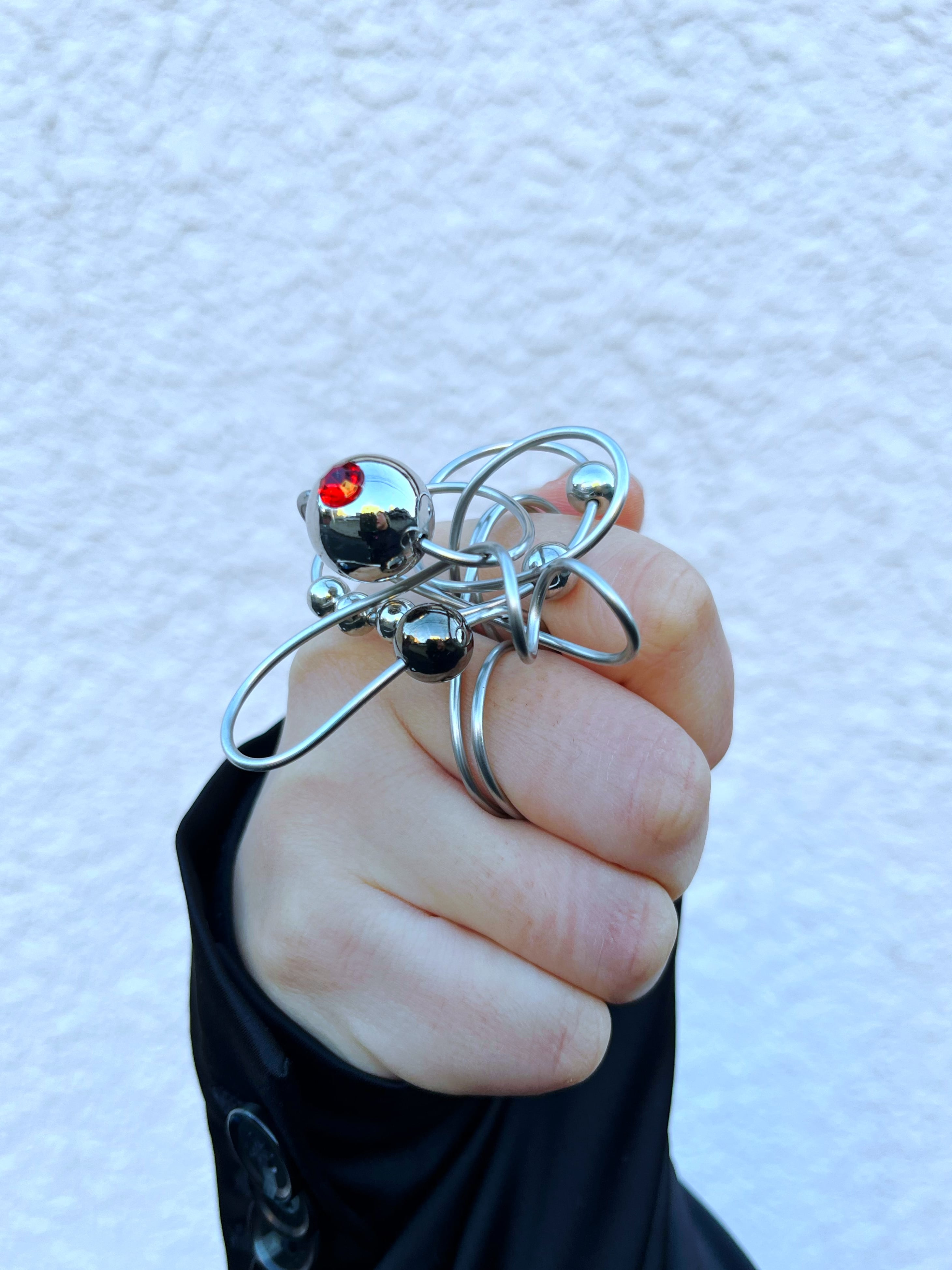 シンプルな線形のシルエットに散りばめられたシルバーのビーズ、中央にはエッジを効かせたレッドのカットビーズを埋め込みパンクな世界観を表現しました。リングサイズも大きめで、メンズも使いやすいアイテムとなっています。